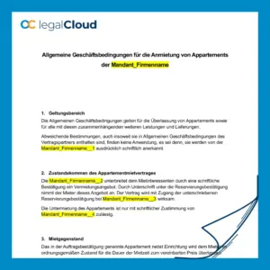 Professionelle AGB für die Anmietung von Appartements: regeln Reservierung und Vertragsschluss, Nutzungsvorgaben (inkl. Rauchverbot), Mietzins und Zahlungsmodalitäten, fristlose Kündigung, Haftung, Rücktritt/Storno, Beendigung mit Rückgabe- und Wiederherstellungspflichten sowie Datenschutz.