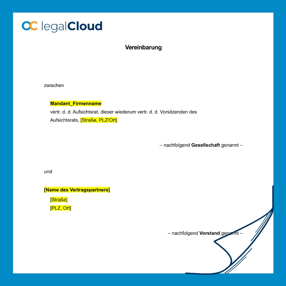 Professionelle Aufhebungsvereinbarung für Vorstände: Regelung zur einvernehmlichen Beendigung, Freistellung, Verdienstanrechnung, Firmenwagennutzung und Zeugnis. Ideal für eine saubere, rechtssichere Trennung auf Führungsebene – inklusive Wettbewerbs- und Verschwiegenheitsklausel.