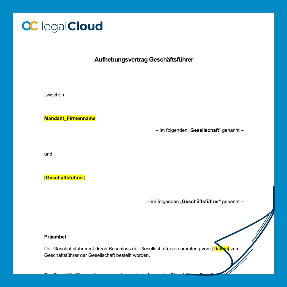 Mit diesem Aufhebungsvertrag beendet Ihr Unternehmen das Geschäftsführeranstellungsverhältnis rechtssicher. Er regelt die Vergütung, Rückgabe von Firmengegenständen, Wettbewerbsverbot und Geheimhaltung. Alle Ansprüche werden abgegolten.