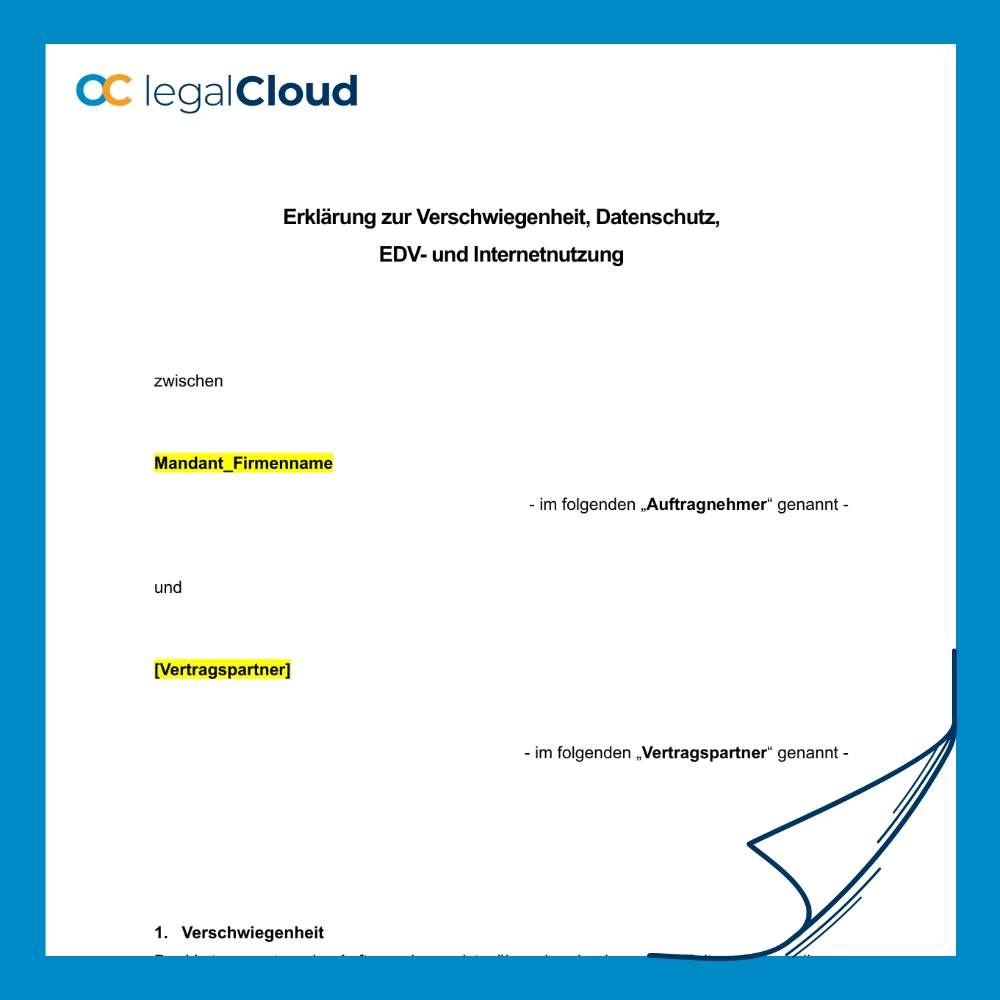 Schützen Sie Ihr Unternehmen mit unserer Datenschutz- und Verschwiegenheitsvereinbarung! Der Vertragspartner verpflichtet sich zu maximaler Vertraulichkeit, sichert den Datenschutz und garantiert eine sichere Nutzung von EDV-Systemen – für eine sorgenfreie und erfolgreiche Zusammenarbeit.