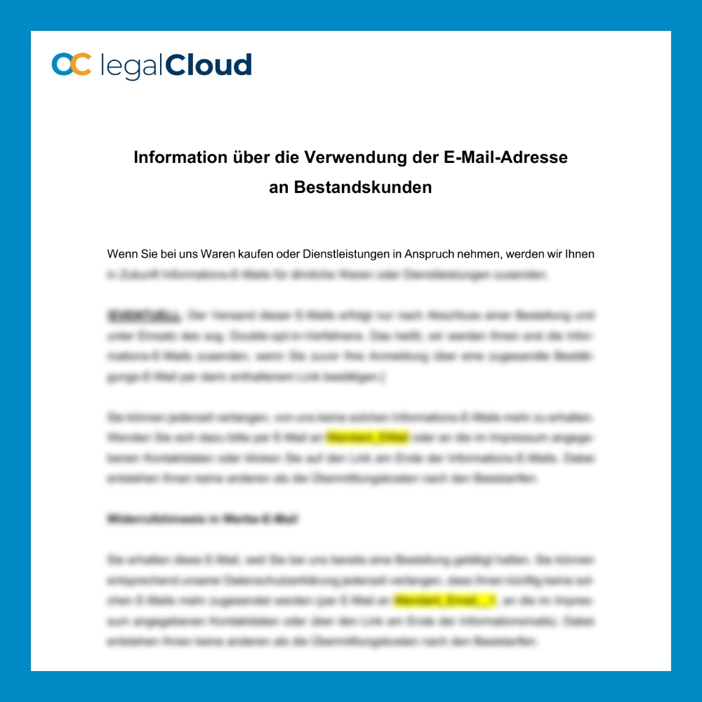Rechtssichere Vorlage zur E-Mail-Werbung an Bestandskunden mit Widerrufshinweis. Perfekt für Shops, die Datenschutz beachten und Kunden rechtlich korrekt informieren wollen.