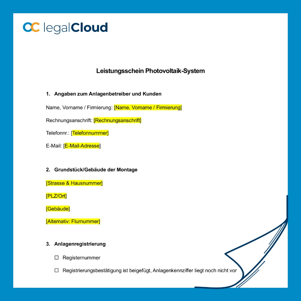 Schlagwörter: Leistungsschein Photovoltaik Anlage, PV Montage Protokoll Muster, Netzanschluss Photovoltaik Dokument, Mitwirkungspflichten Kunde PV Vertrag, Inbetriebnahme Photovoltaik Checkliste