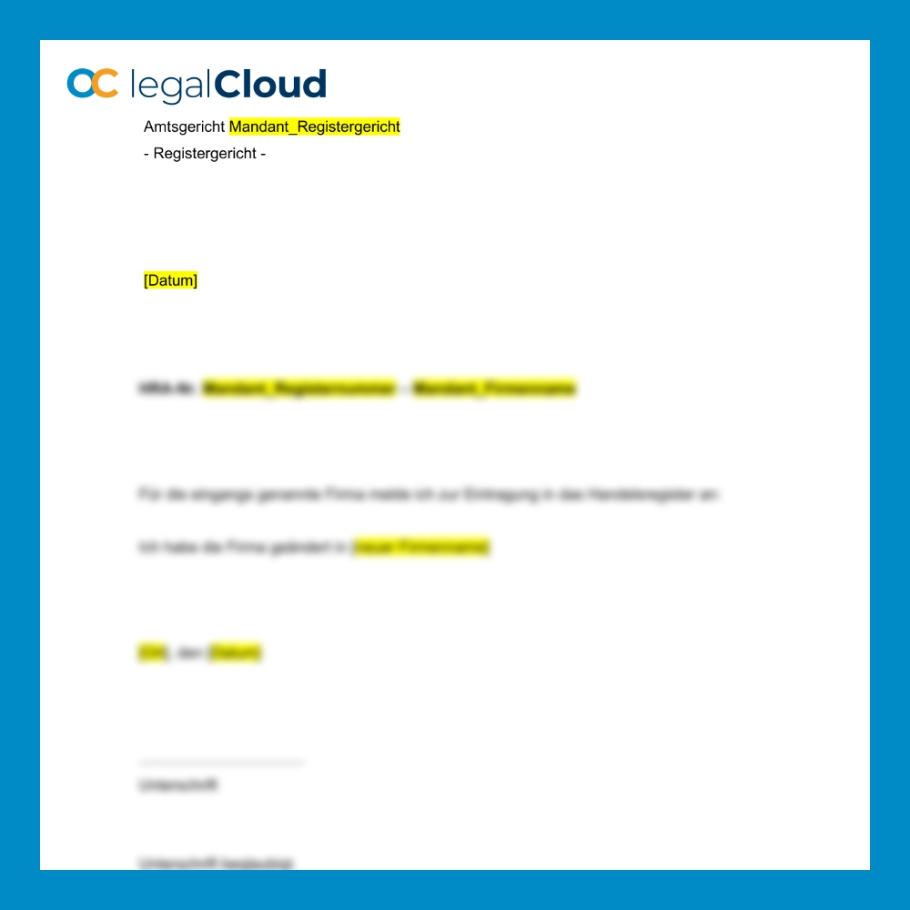 Melden Sie die Änderung Ihres Firmennamens zur Eintragung ins Handelsregister an. Dieses Dokument stellt sicher, dass die Namensänderung korrekt und rechtssicher dokumentiert wird.
