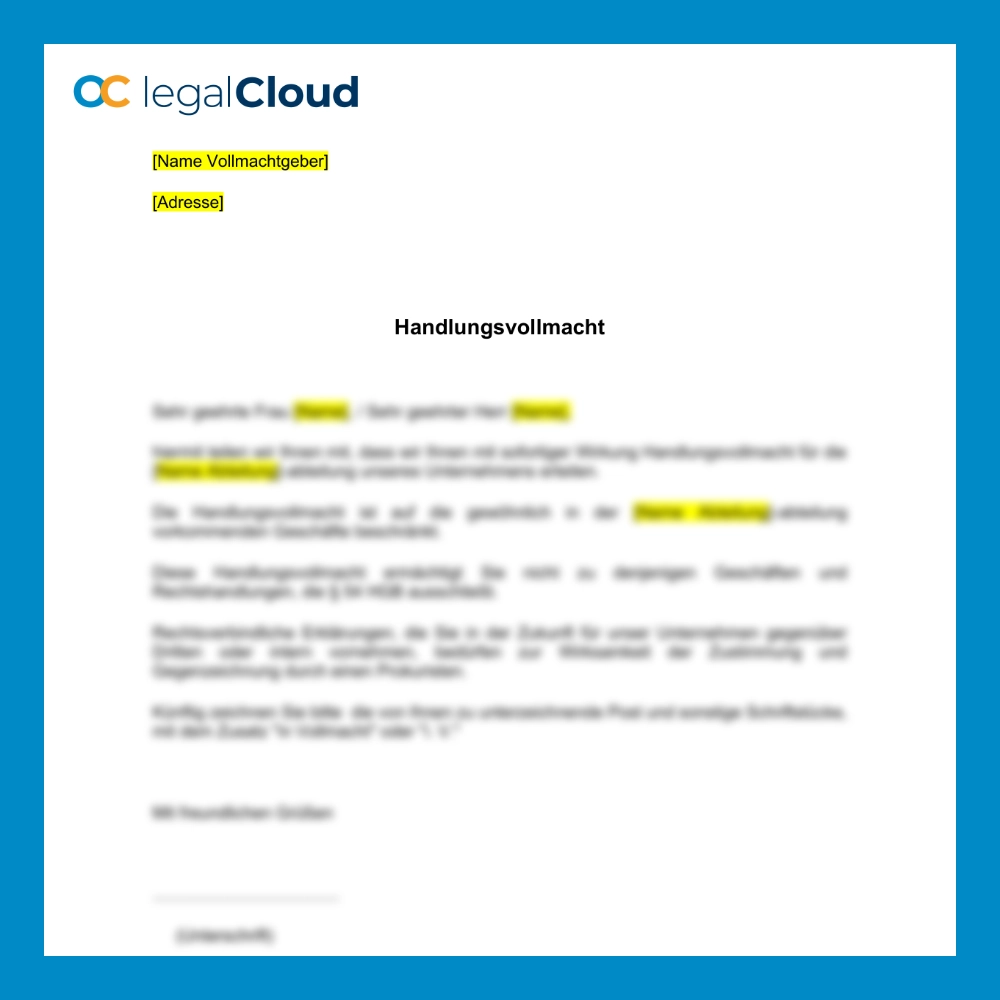Erweitern Sie Ihre unternehmerische Flexibilität! Mit dieser Handlungsvollmacht vergeben Sie die Befugnis, alle gängigen Geschäfte in einer bestimmten Abteilung zu führen. Die Handlungsbefugnis wird klar definiert, ohne den Rahmen des HGB zu überschreiten – für schnelle, effiziente Entscheidungen und Handlungen im Unternehmensalltag.