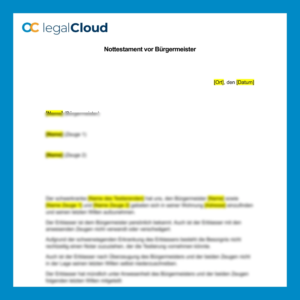 Rechtssichere Vorlage für ein Nottestament vor einem Bürgermeister, das bei schwerer Krankheit und Testierunfähigkeit des Erblassers verwendet wird. Der Erblasser teilt seinen letzten Willen mündlich mit, und der Bürgermeister sowie zwei Zeugen bestätigen die Testierfähigkeit und nehmen das Testament auf. Ideal, wenn ein Notar nicht rechtzeitig erreichbar ist.