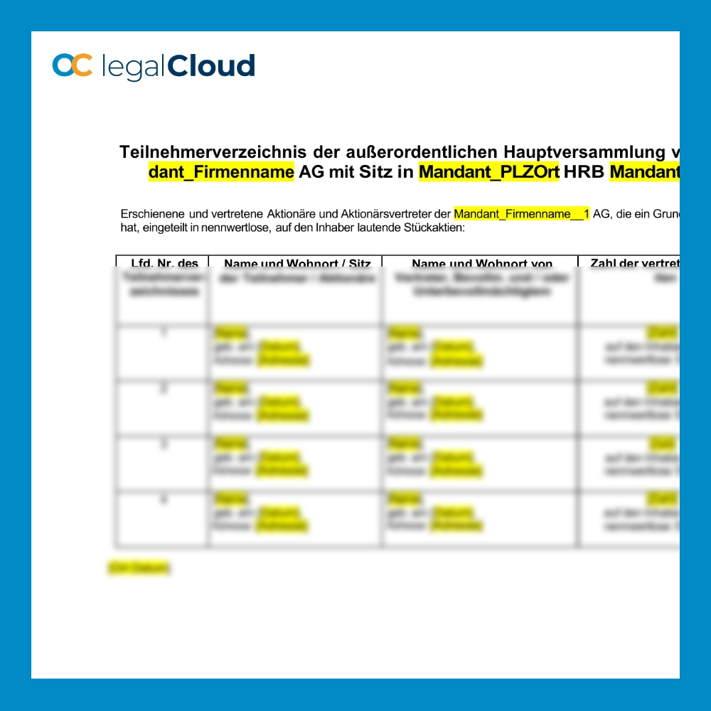 Nutzen Sie dieses Teilnehmerverzeichnis für die außerordentliche Hauptversammlung Ihrer AG. Es listet alle erschienenen und vertretenen Aktionäre sowie deren vertretende Aktienanteile auf. Ideal für Unternehmen, die ihre Hauptversammlung ordnungsgemäß dokumentieren und den Anteil der Aktionäre und Vertreter transparent im Einklang mit den rechtlichen Vorgaben erfassen möchten.