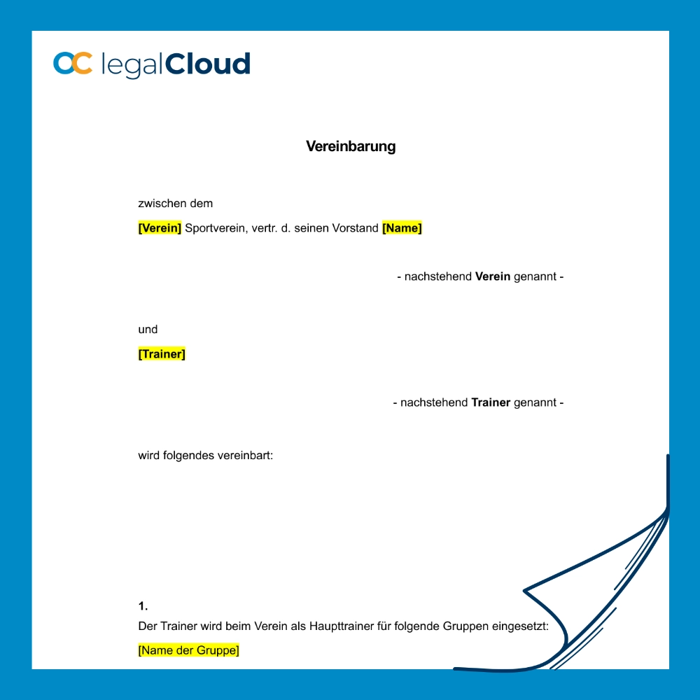 Regeln Sie die Anstellung Ihres Trainers effektiv: Dieser Vertrag umfasst Trainingsaufgaben, Vergütung, Krankheitsregelungen, Urlaub und Verhaltenspflichten. Kündigungsfristen sind ebenfalls klar definiert. Optimal für Sportvereine.