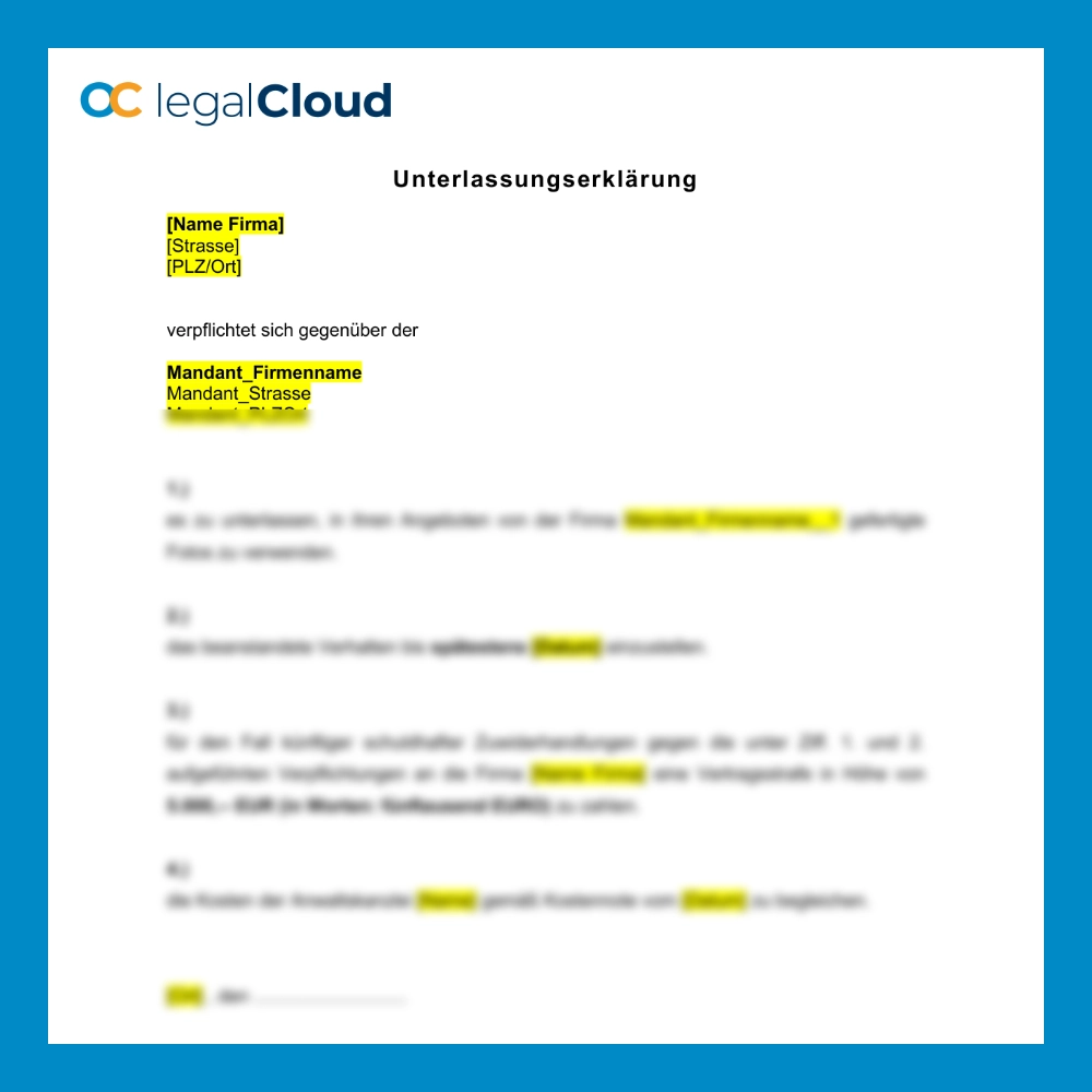 Mit dieser rechtsverbindlichen Unterlassungserklärung schützt Ihr Unternehmen sein kreatives Eigentum: Die unerlaubte Nutzung firmeneigener Fotos durch Dritte wird verboten. Bei Verstoß droht eine Vertragsstrafe von 5.000 €. Zusätzlich werden Anwaltskosten übernommen. Ein starkes Signal zur Wahrung Ihrer Bildrechte – klar, wirksam und abschreckend.