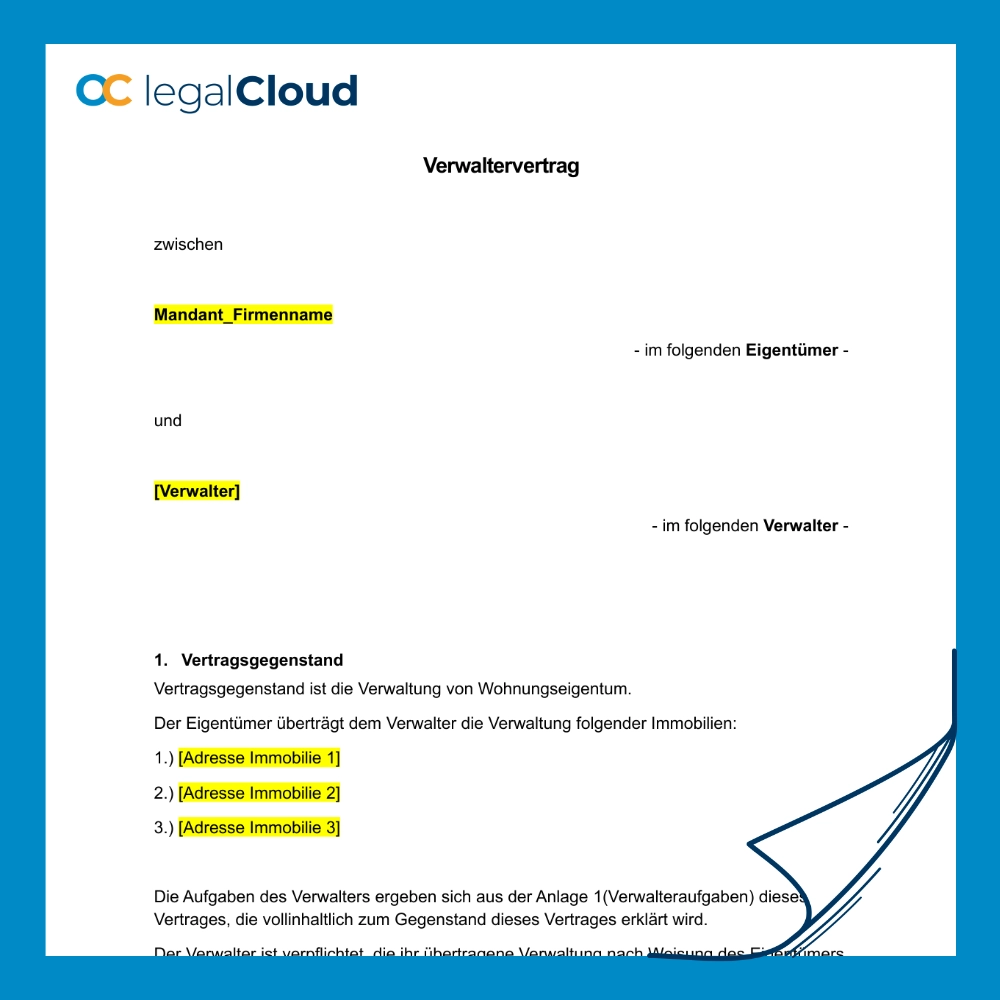 Bieten Sie Ihrem Eigentum die perfekte Verwaltung mit diesem Vertrag. Der Verwalter kümmert sich um alle Aufgaben – von Mietverträgen und Instandhaltungsmaßnahmen bis hin zu Nebenkostenabrechnungen. Steigern Sie den Wert Ihrer Immobilien durch professionelle Betreuung!